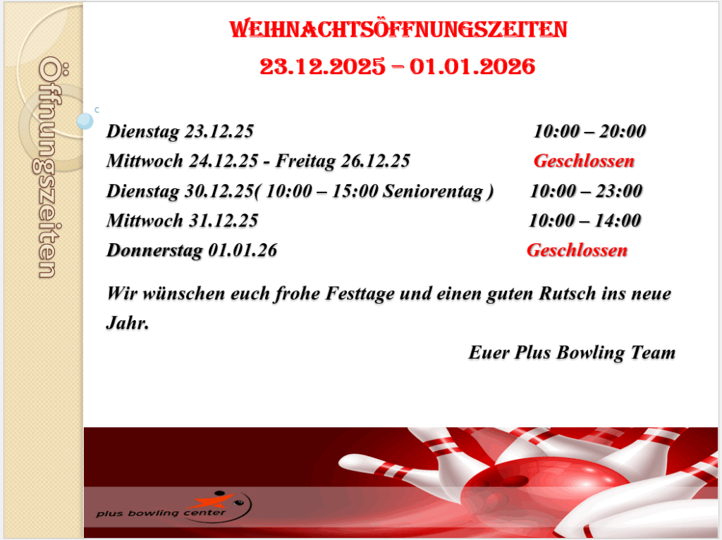 Bowling Flatrate 3 Stunden inklusive Leihschuhe um Euro 80,00 bis zu 8 Spieler/innen pro Bahn möglich